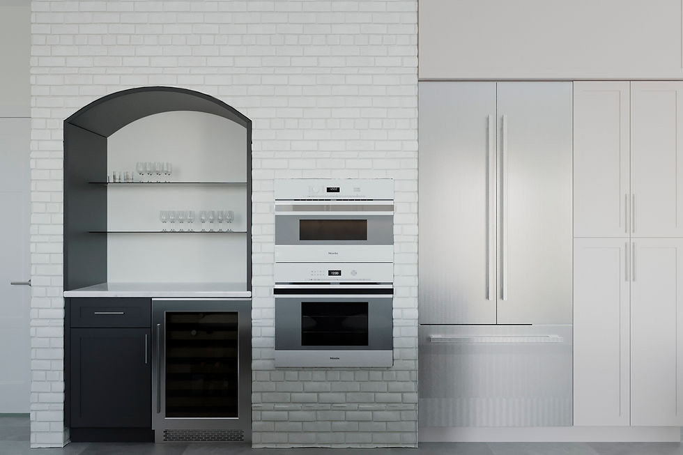 A warm, two-toned kitchen with bright finishes, thoughtfully designed around a center-island range that brings cooking into the heart of the space while maintaining an open, inviting flow.